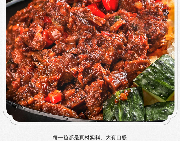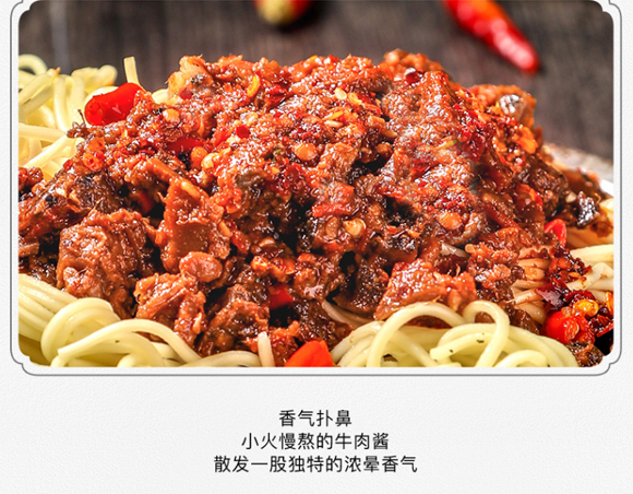 配料:食用植物油、辣椒、豆瓣醬(辣椒、蠶豆、食用鹽、小麥粉、山梨酸鉀)、花生、大豆、香菇、姜、牛肉、食用鹽、香辛料、食品添加劑(谷氨酸鈉、5-呈味核苷酸二鈉、山梨酸鉀)
