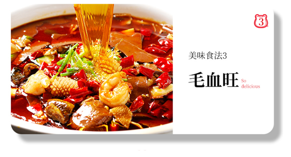 3.本品亦可用于炒菜、燒菜(燒制兔、雞、鴨、魚牛、羊肉)、毛血旺、冒菜水煮系列、粉面食等。